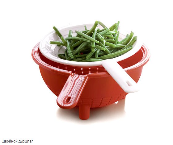 Двойной дуршлаг состоит из большого дуршлага красного цвета с удобной ручкой и дуршлага меньшего размера белого цвета с аналогичной ручкой.